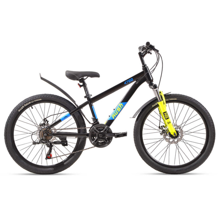 Горный подростковый велосипед RUSH 4700 24 дюйма с дисковыми тормозами подойдет для мальчиков и девочек ростом 130-145 см. Рама 13 с гарантией 5 лет изготовлена с применением технологии техноформинга и внутренней проводки тросов. Пружинно-эластомерная вилка ход 50 мм. Трансмиссия 21 скоростная, задний переключатель SHIMANO TZ500, передний RHR 500 на руле комбиручки RHR EF-51. Двойной алюминиевый обод рассчитан на нагрузку до 120 кг. Руль и сиденье регулируется по высоте. Вес велосипеда 16,4 кг. На нижней трубе есть крепеж для держателя бутылки или насоса. Крылья, подножка и защита цепи в подарок.