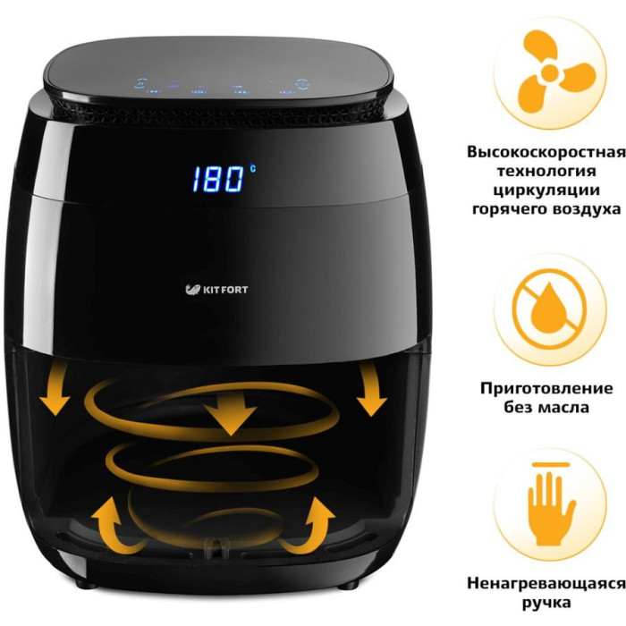 Температура аэрогриля KITFORT КТ-2202 варьируется от 80 до 200 градусов, которая достигает своего максимума за три минуты. Подобрать нужный режим можно при помощи простого электронного управления со встроенным дисплеем. Устройство укомплектовано поддоном и специальной корзиной для наиболее комфортной эксплуатации.